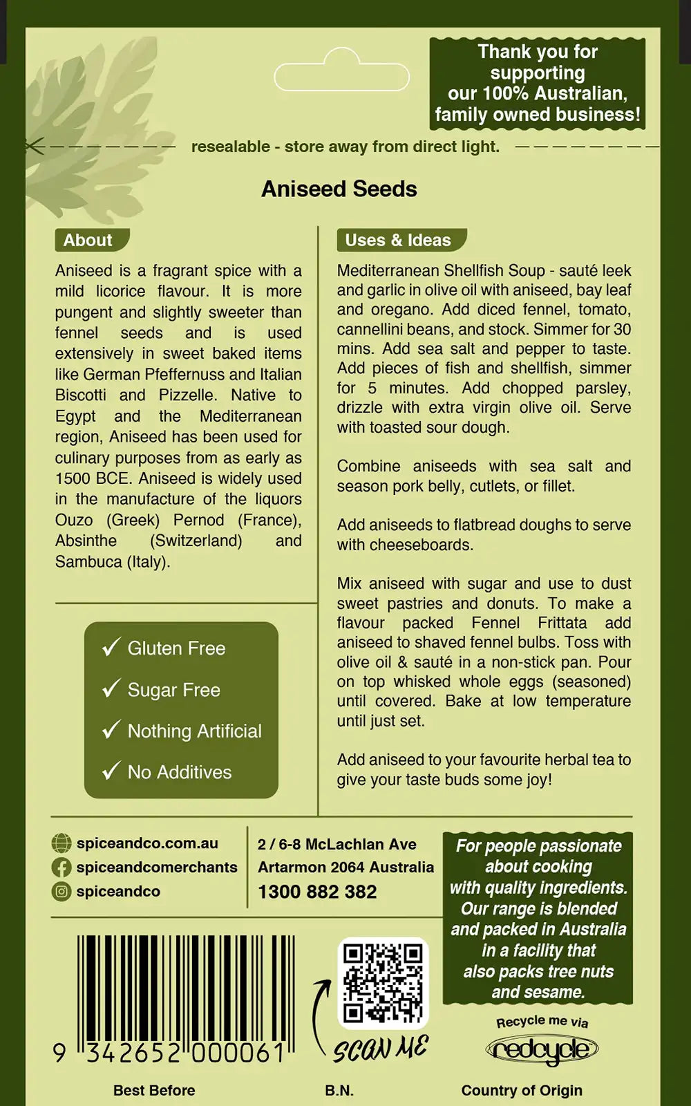 Aniseed is a fragrant spice with a mild licorice flavour. It is more pungent and slightly sweeter than fennel seeds and is used extensively in sweet baked items like German Pfeffernuss and Italian Biscotti and Pizzelle. Native to Egypt and the Mediterranean region, Aniseed has been used for culinary purposes from as early as 1500 BCE. Aniseed is widely used in the manufacture of the liquors Ouzo (Greek) Pernod (France) and Absinthe (Switzerland) and Sambuca (Italy).