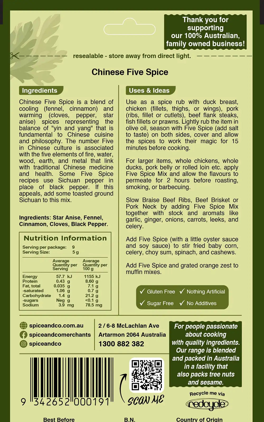 Use as a spice rub with duck breast, chicken (fillets, thighs, or wings), pork (ribs, fillet or cutlets), beef flank steaks, fish fillets or prawns. Lightly rub the item in olive oil, season with Five Spice (add salt to taste) on both sides, cover and allow the spices to work their magic for 15 minutes before cooking.
