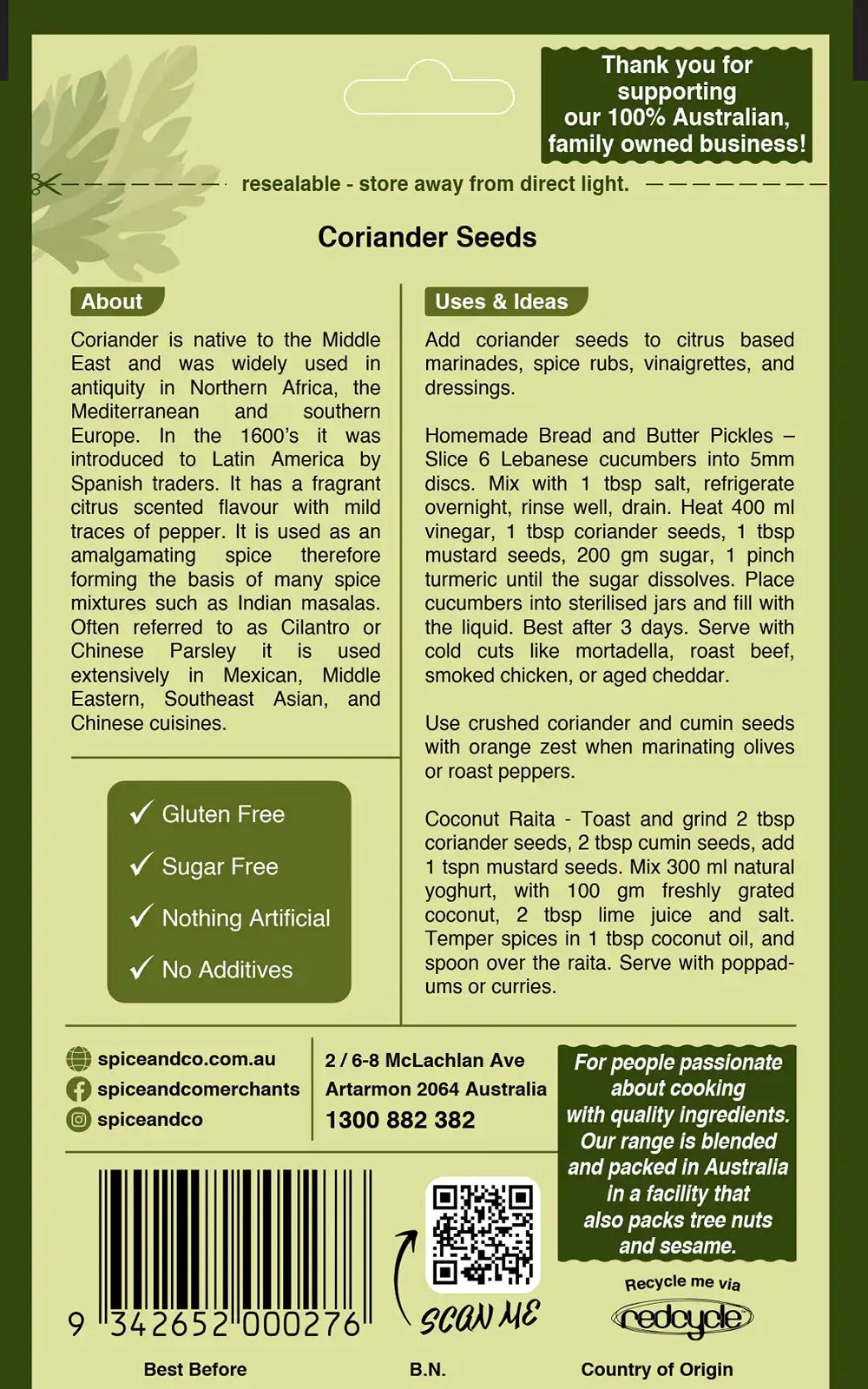 Add coriander seeds to citrus based marinades, spice rubs, vinaigrettes, and dressings.