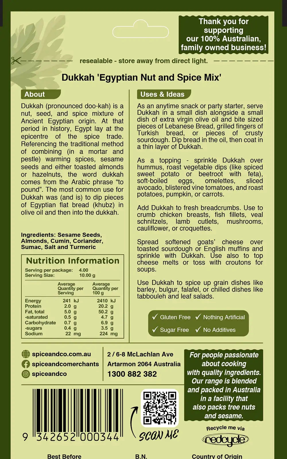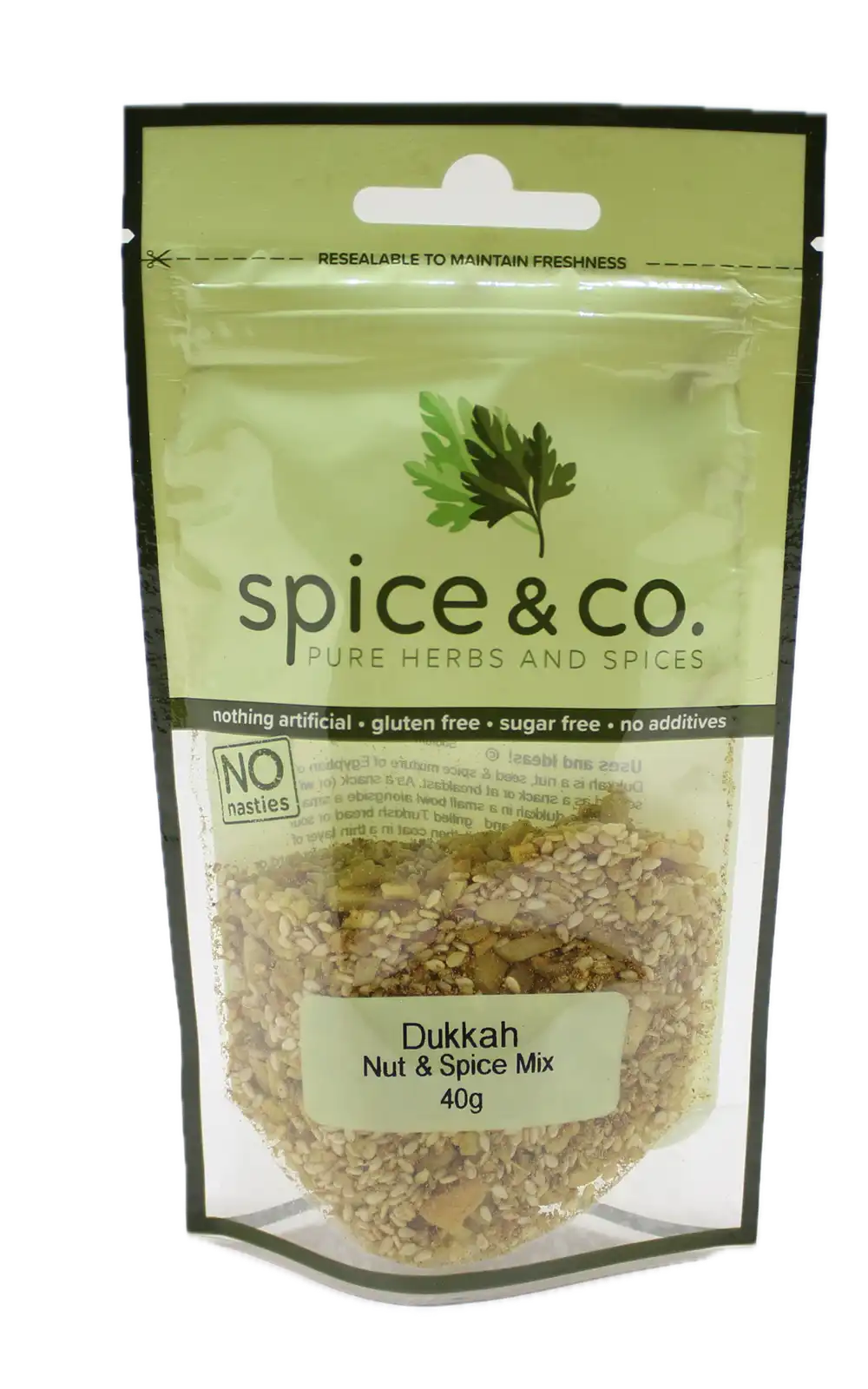 Use Dukkah to spice up grain dishes like barley, bulgur, falafel, or chilled dishes like tabouleh and leaf salads.