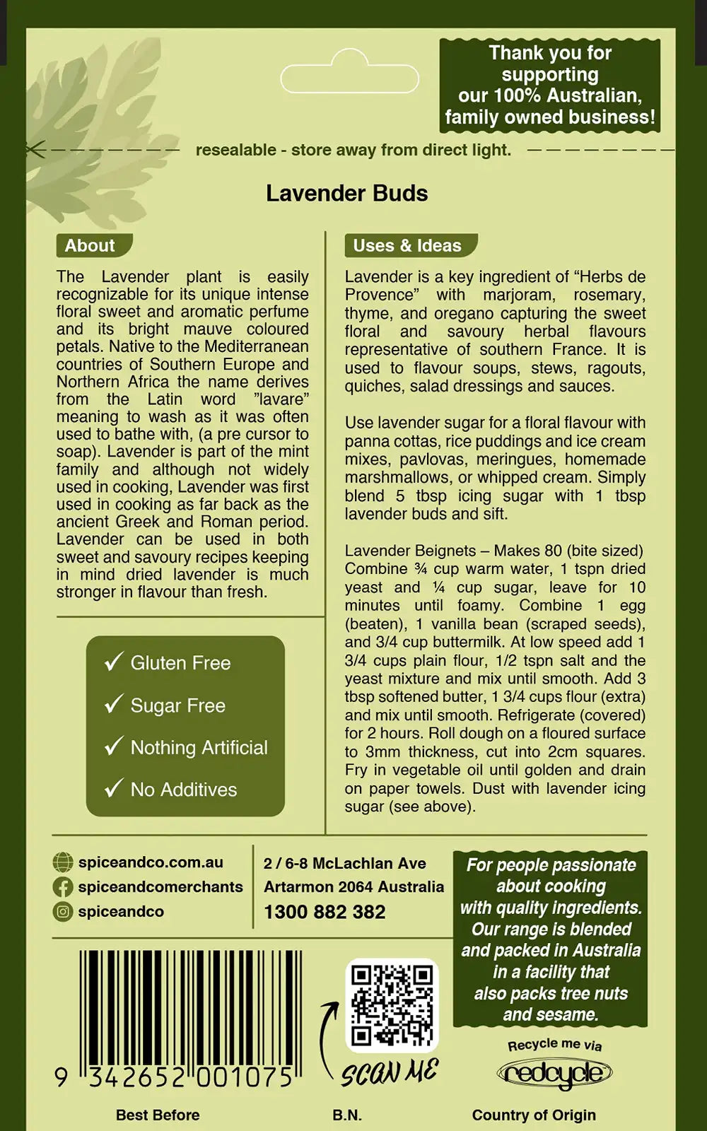 Lavender is a key ingredient of “Herbs de Provence” with marjoram, rosemary, thyme, and oregano capturing the sweet floral and savoury herbal flavours representative of southern France. It is used to flavour soups, stews, ragouts, quiches, salad dressings and sauces.