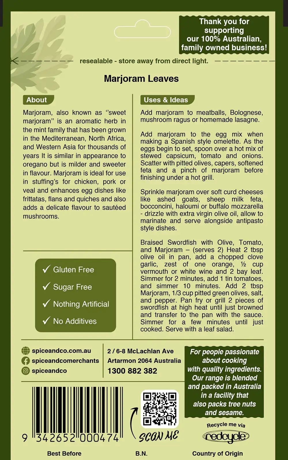Sprinkle marjoram over soft curd cheeses like ashed goats, sheep milk feta, bocconcini, haloumi or buffalo mozzarella - drizzle with extra virgin olive oil, allow to marinate and serve alongside antipasto style dishes.