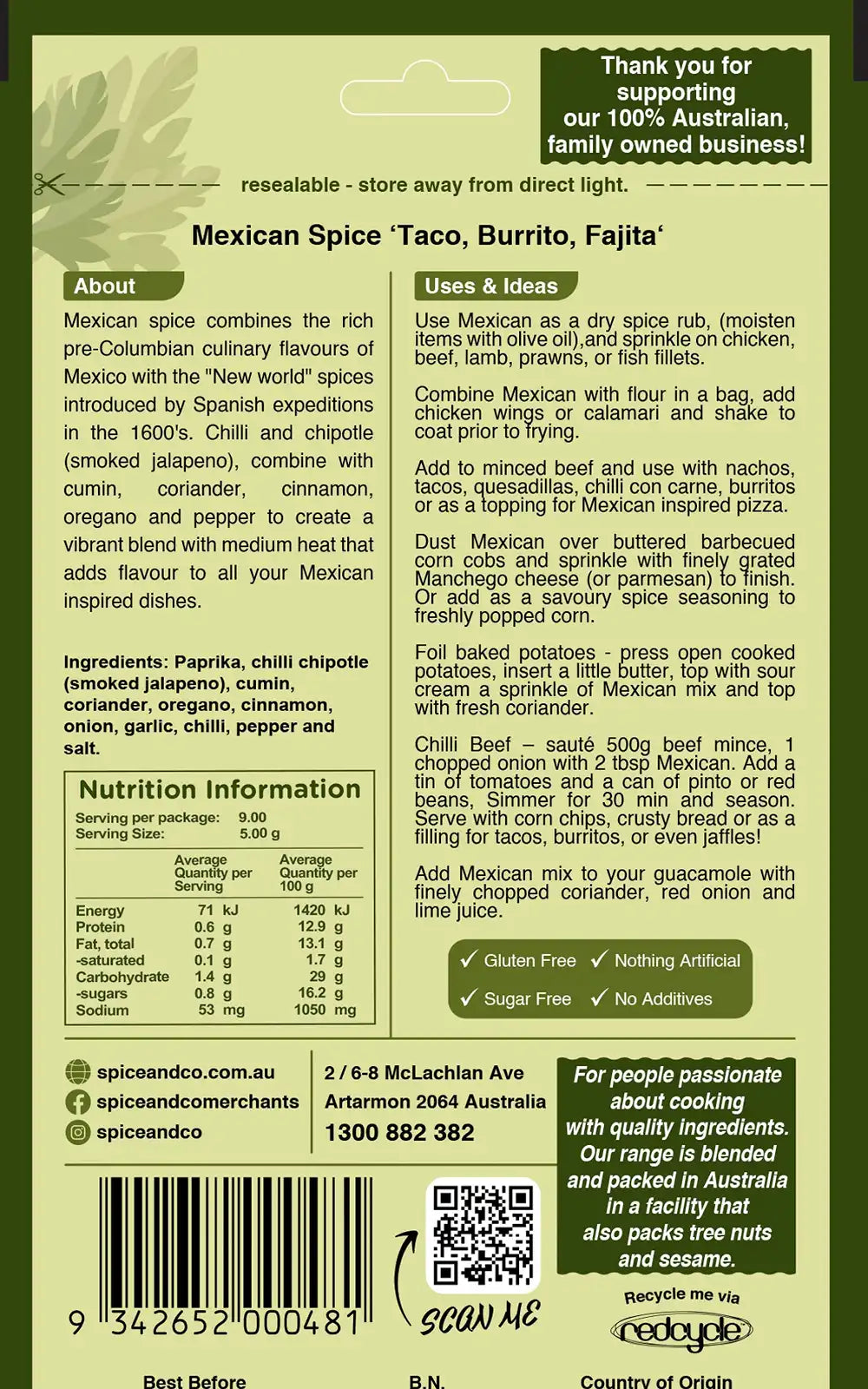 Use Mexican as a dry spice rub, (moisten items with olive oil) and sprinkle on chicken, beef, lamb, prawns, or fish fillets.
