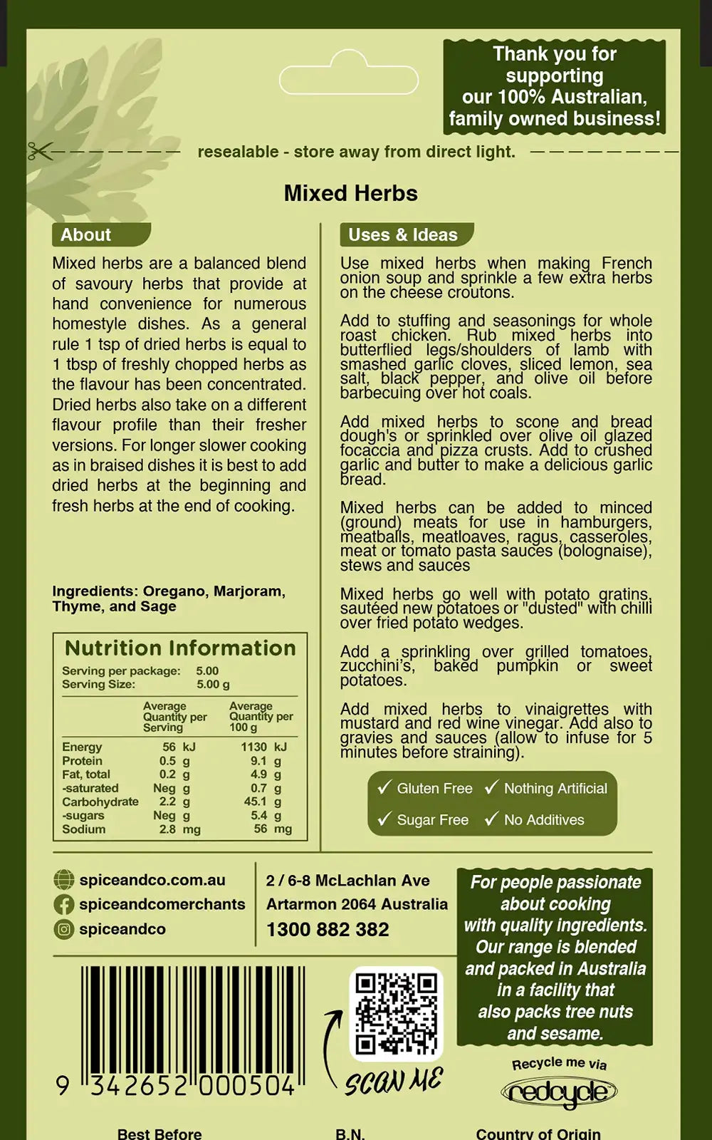 Add mixed herbs to scone and bread dough's or sprinkled over olive oil glazed focaccia and pizza crusts. Add to crushed garlic and butter to make a delicious garlic bread.