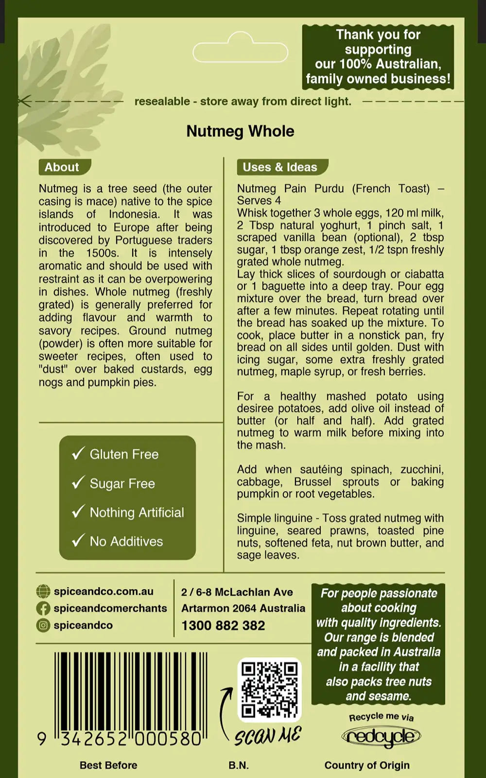 Whisk together 3 whole eggs, 120 ml milk, 2 Tbsp natural yoghurt, 1 pinch salt, 1 scraped vanilla bean (optional), 2 tbsp sugar, 1 tbsp orange zest, 1/2 tspn freshly grated whole nutmeg. Lay thick slices of sourdough or ciabatta or 1 baguette into a deep tray. Pour egg mixture over the bread, turn bread over after a few minutes. Repeat rotating until the bread has soaked up the mixture. To cook, place butter in a nonstick pan, fry bread on all sides until golden. Dust with icing sugar, some extra freshly grated nutmeg, maple syrup, or fresh berries.