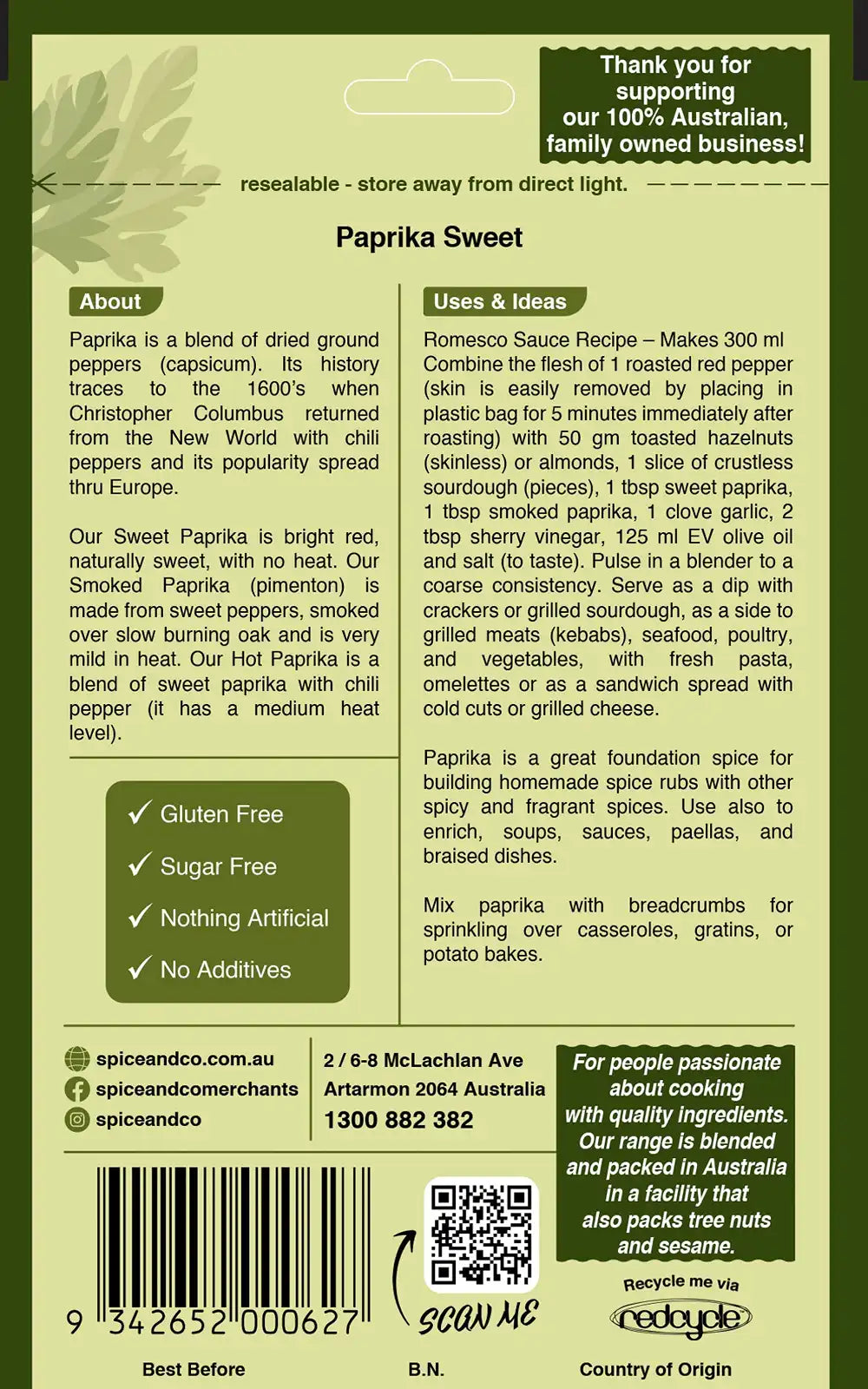 Paprika is a great foundation spice for building homemade spice rubs with other spicy and fragrant spices. Use also to enrich, soups, sauces, paellas, and braised dishes.