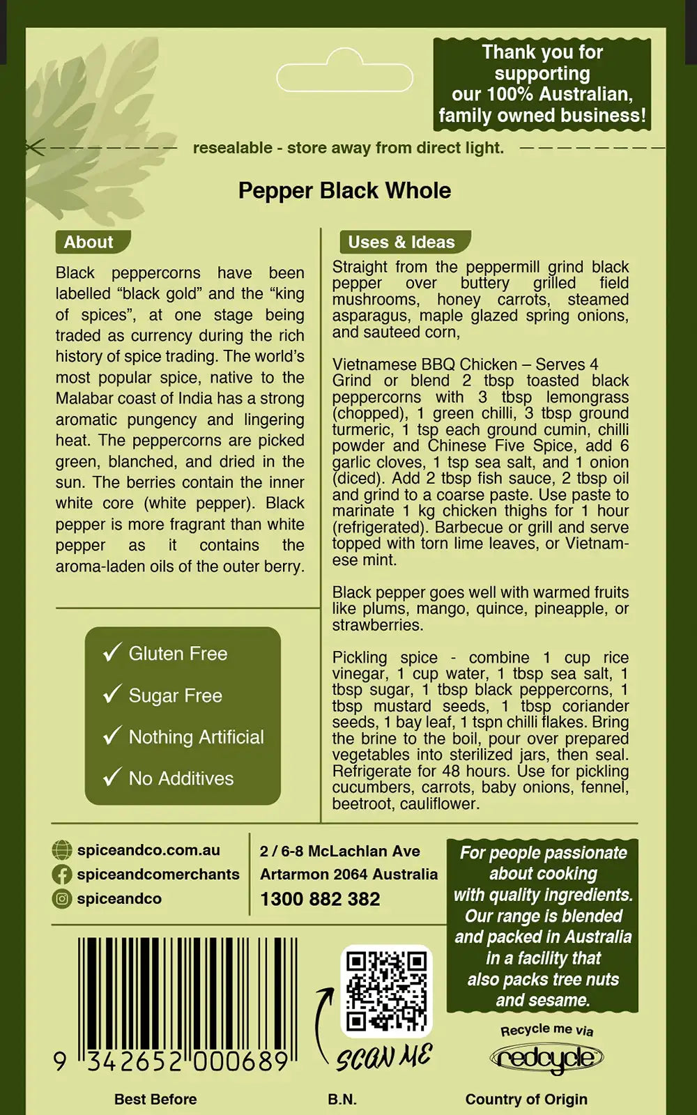 Grind or blend 2 tbsp toasted black peppercorns with 3 tbsp lemongrass (chopped), 1 green chilli, 3 tbsp ground turmeric, 1 tsp each ground cumin, chilli powder and Chinese five spice, add 6 garlic cloves, 1 tsp sea salt, and 1 onion (diced). Add 2 tbsp fish sauce, 2 tbsp oil and grind to a coarse paste. Use paste to marinate 1 kg chicken thighs for 1 hour (refrigerated). Barbecue or grill and serve topped with torn lime leaves, or Vietnamese mint.