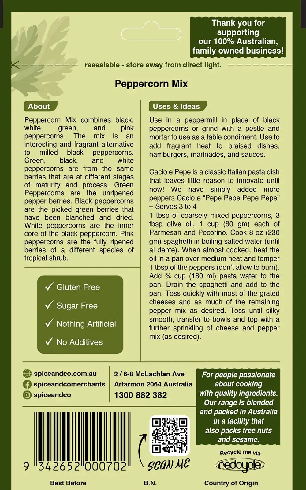 Use in a peppermill in place of black peppercorns or grind with a pestle and mortar to use as a table condiment. Use to add fragrant heat to braised dishes, hamburgers, marinades, and sauces.