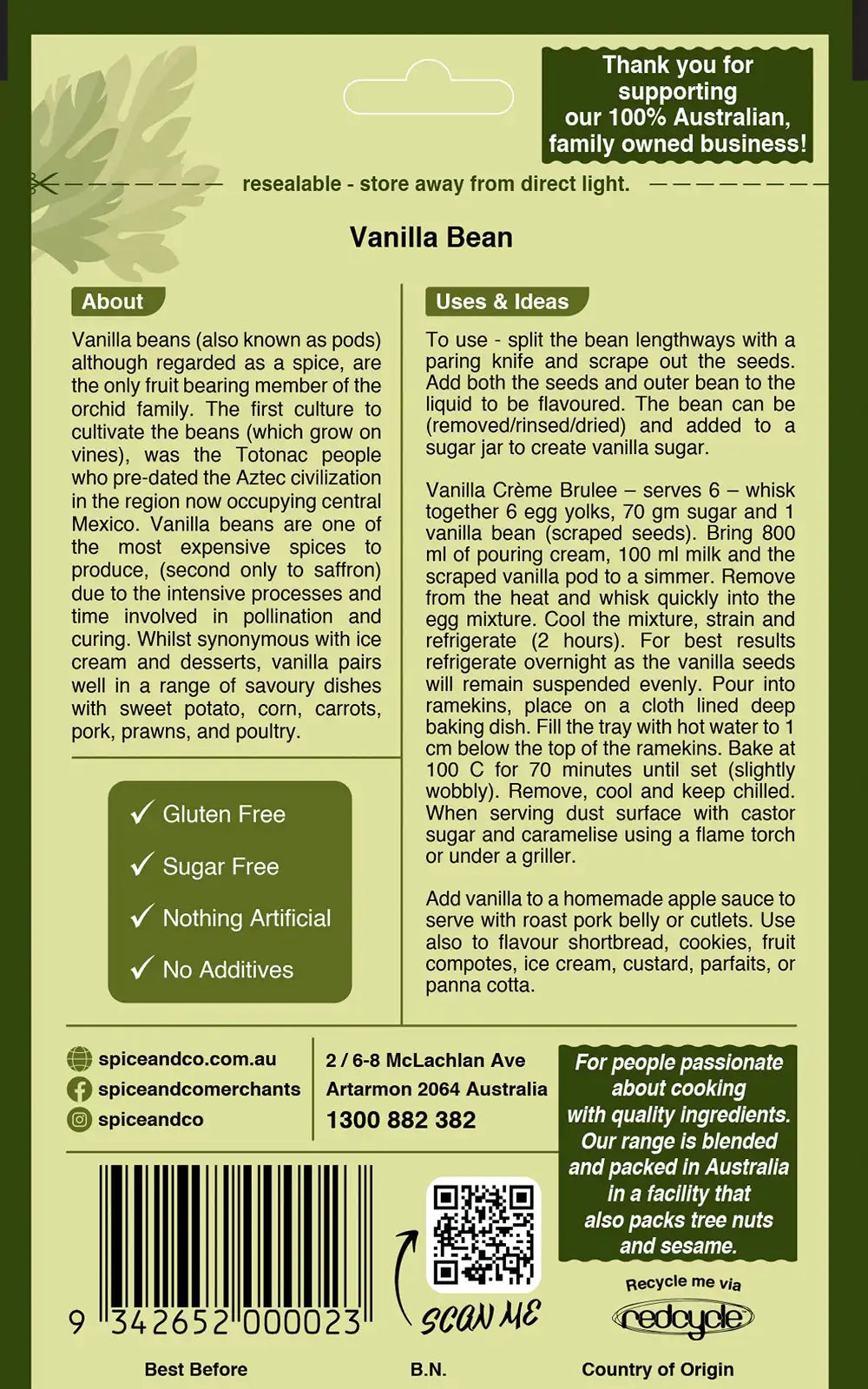 To use - split the bean lengthways with a paring knife and scrape out the seeds. Add both the seeds and outer bean to the liquid to be flavoured. The bean can be (removed/rinsed/dried) and added to a sugar jar to create vanilla sugar.